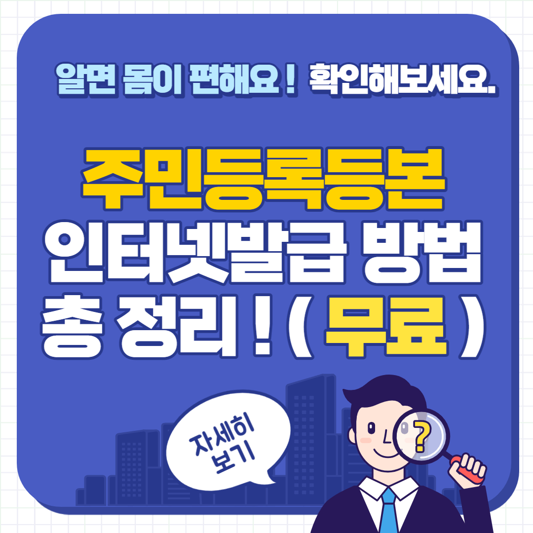 1분 만에 주민등록등본 발급 방법! 오늘 소개해드릴 내용은 동사무소를 방문하지 않고, 주민등록등본(초본)을 받을 수 있는 방법입니다. 이 방법을 한번 습득하시면, 앞으로는 동사무소 방문 할 일은 더 이상 없습니다. 해당 글을 끝까지 읽고 빠르게 주민등록등본 발급 받아서 활용해보세요.
