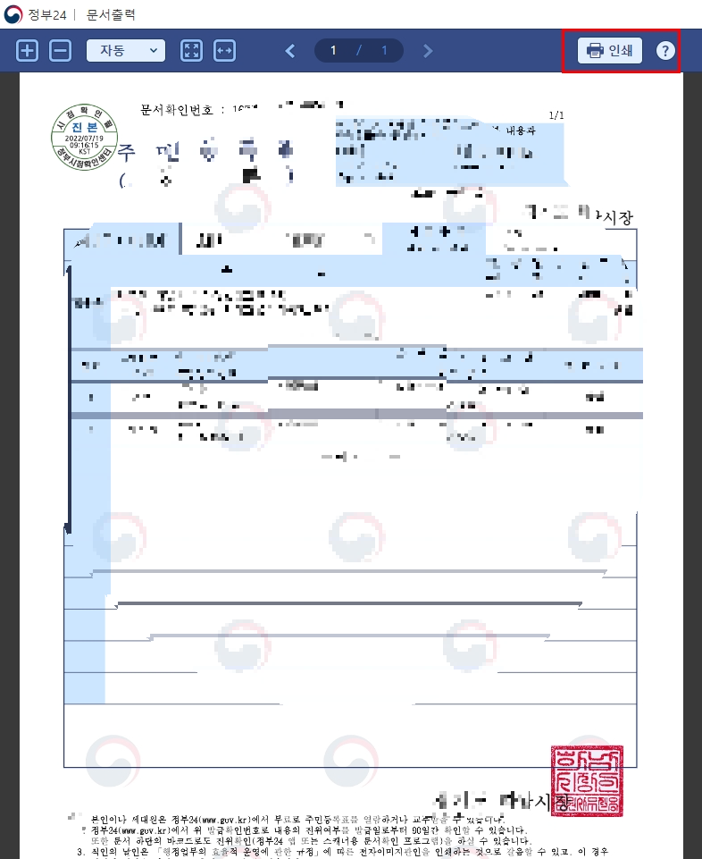 버튼을 클릭하셨다면, 아래와 같이 문서를 인쇄할 수 있는 화면이 나옵니다. 여기서 오른쪽 상단에 있는 인쇄 버튼을 클릭해야합니다. 아래 2가지 기능을 선택해서 수행할 수 있습니다.