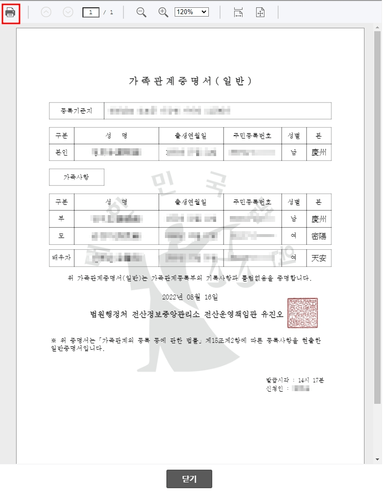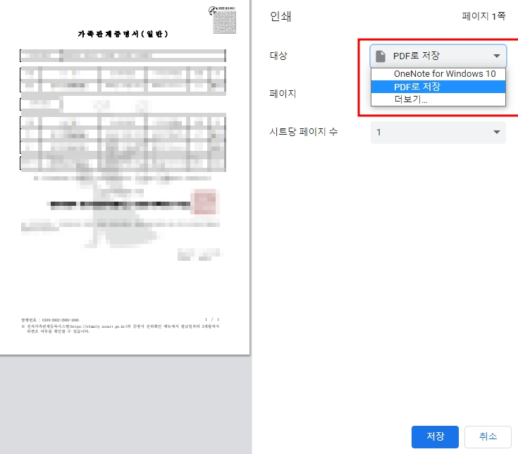 * 프린터가 설치되어 있다면 해당 프린터를 선택해서 가족관계증명서를 종이로 바로 출력도 가능합니다.