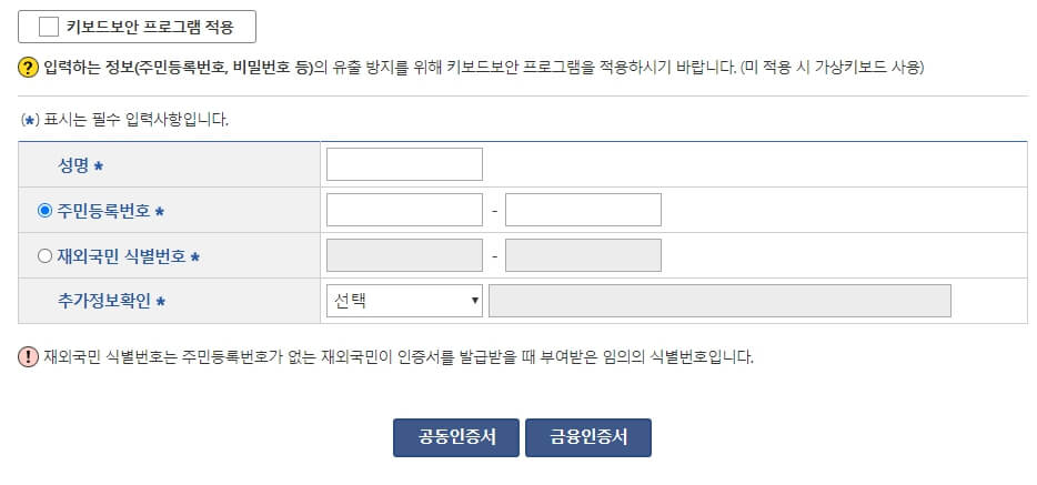 주요 정보( 성명, 주민등록번호, 추가정보확인)을 입력해야 합니다. 입력한 정보를 기준으로 가족관계를 증명하기 위한 기준 정보로 활용됩니다.