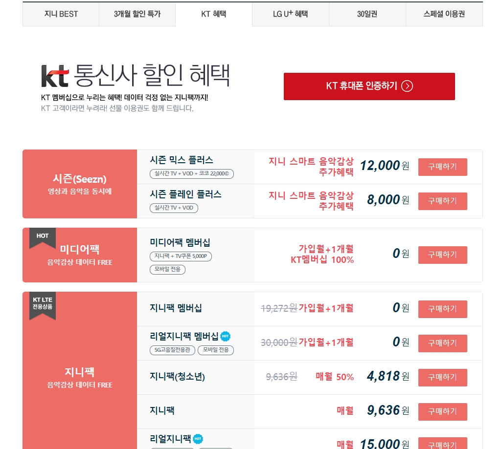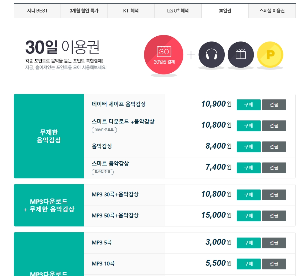 뮤직 이용권을 교체하거나, 새로 구매를 고민하고 있는 분이라면 한번 해당 정보를 확인하고 스폐셜 이용권 구매를 하는 것도 추천드립니다. 그리고 만약 통신사가 kt라면 지니뮤직을 구매하는 것이 이점이 많이 있습니다. 통신 포인트를 통해서도 구매하가 가능하더라고요.