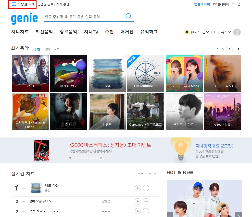 지니 홈페이지에 접속하시면 다음가 같은 화면을 확인 할 수 있습니다. 음악을 제공하는 주요 서비스에 맞게 주로 음악을 소개하는 UI 화면 구성을 가지고 있습니다. 다양한 메뉴 중에서 이용권 요금제를 확인하기 위해서는 "이용권 구매" 라는 메뉴를 클릭하시면 됩니다.