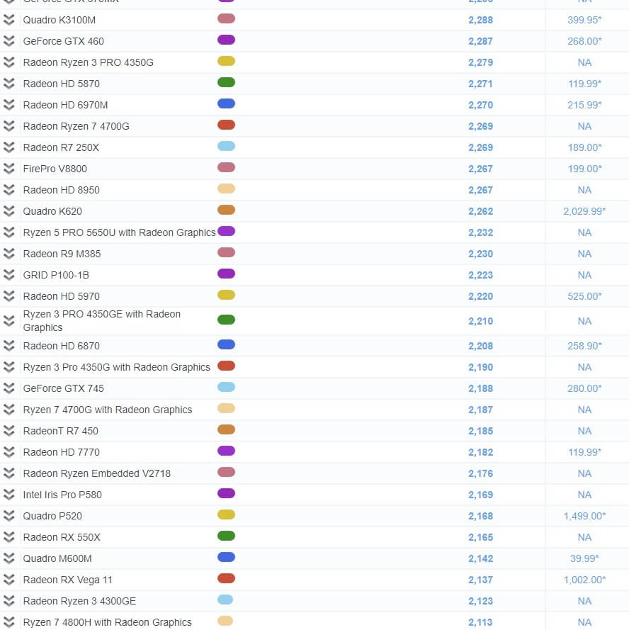| 75 | GeForce GT 1030 | 2,608 | 106.99 |