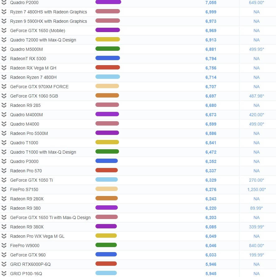 | 19 | GeForce GTX 1650 (Mobile) | 6,969 | NA |
