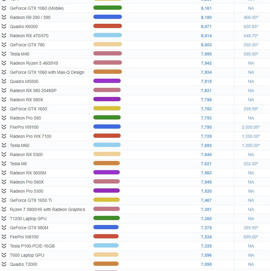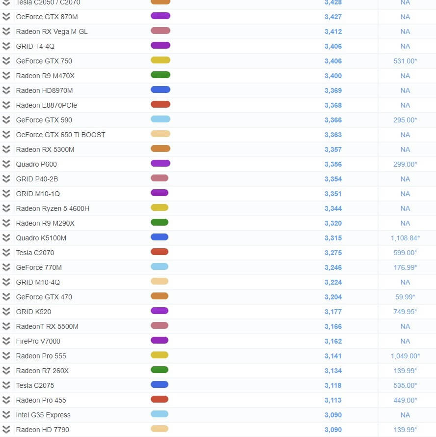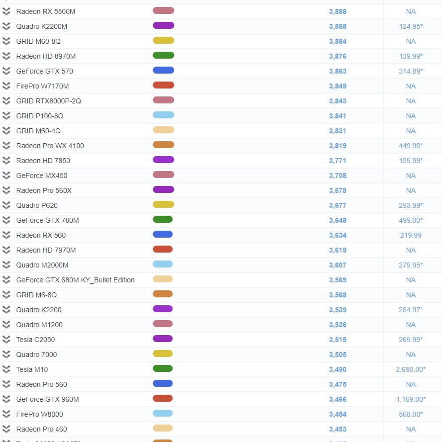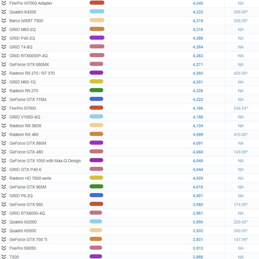 | 39 | GeForce GTX 1050 (Mobile) | 4,462 | NA |