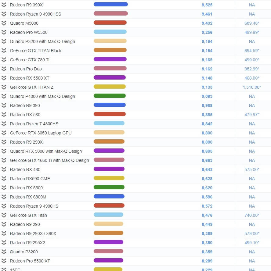 | 9 | GeForce GTX TITAN Z | 9,133 | 1,510.00* |
