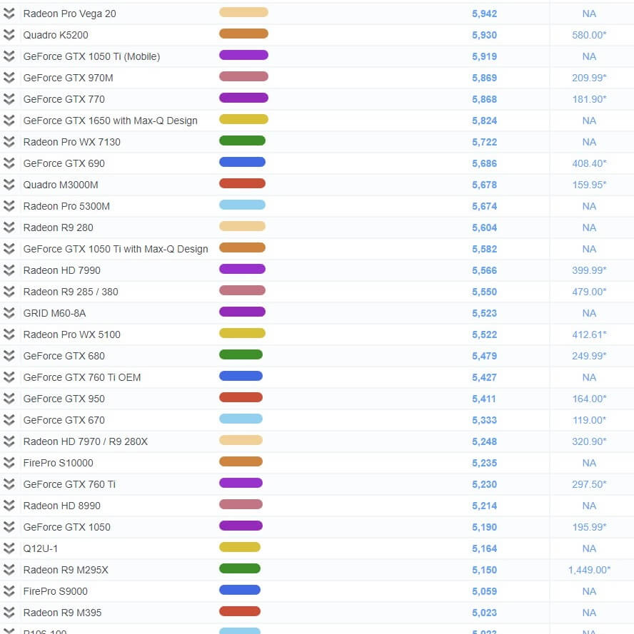 | 30 | GeForce GTX 1050 Ti with Max-Q Design | 5,582 | NA |