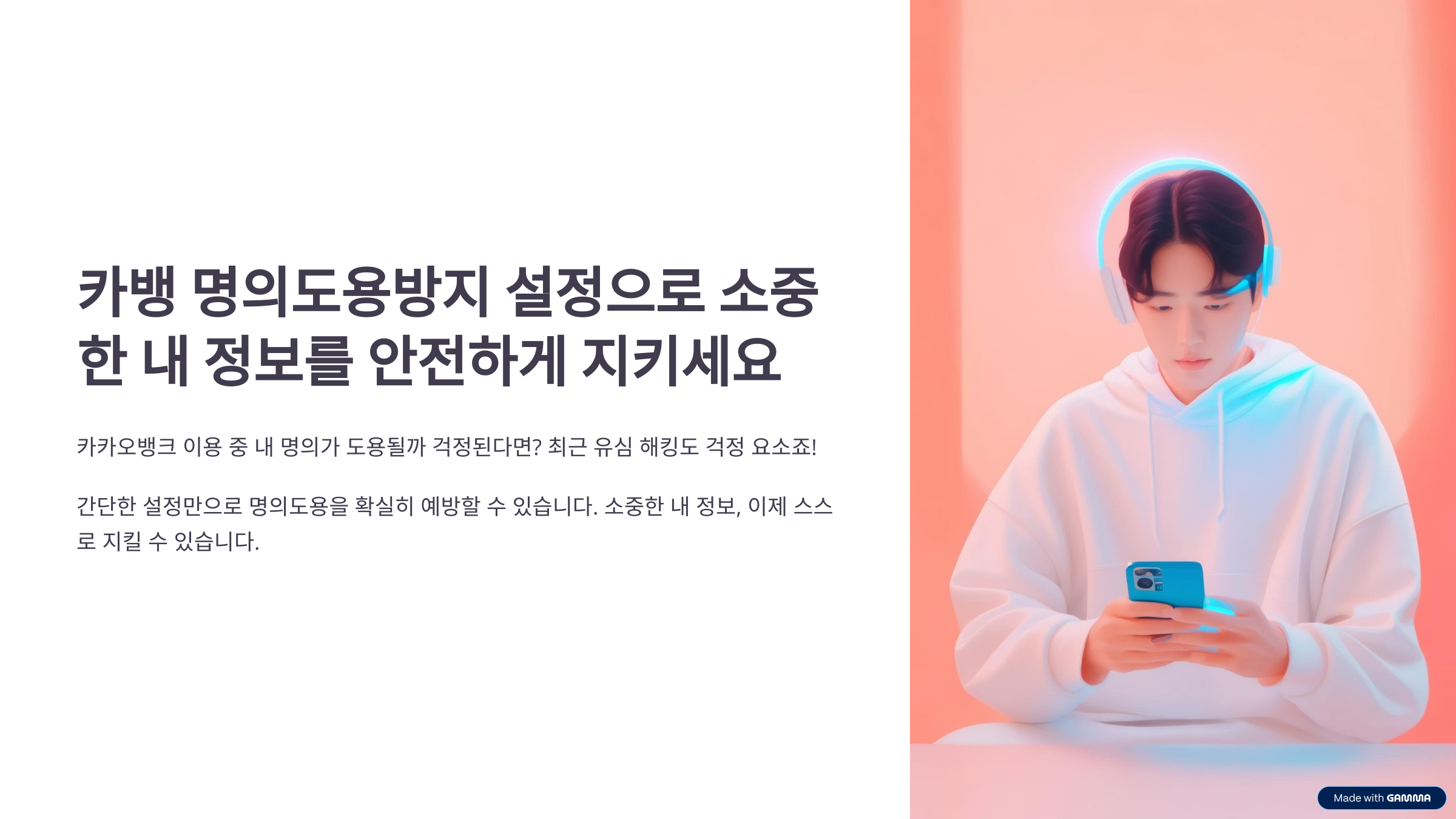 "카뱅 명의도용방지 설정으로 소중한 내 정보를 안전하게 지키세요." 카카오뱅크 이용 중 내 명의가 도용될까 걱정된다면? 최근 유심 해킹도 걱정 요소죠!