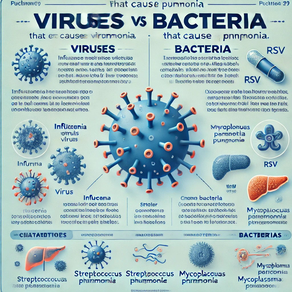 1. 바이러스성 폐렴 : 주로 독감, 코로나19, RSV(호흡기 세포 융합 바이러스) 등과 같은 바이러스가 원인입니다. 이 경우 공기를 통한 비말 전파 가 가능하여, 감염자와 밀접한 접촉 시 감염 위험이 높습니다.