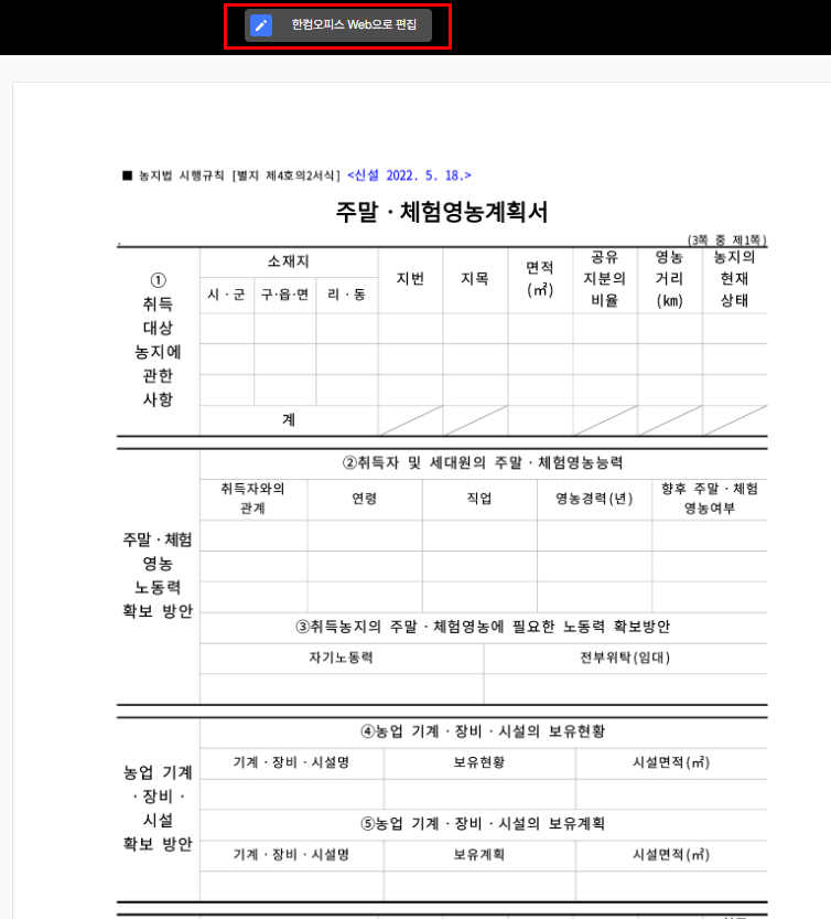 상단에 있는 "한컴 오피스 web으로 편집" 버튼을 선택해주세요. 기본적인 글자 수정, 표 편집, 서식 변경 등 꼭 필요한 기능은 모두 갖추고 있어 가벼운 문서 편집에는 충분합니다. 과제·업무 보고서·표 수정 정도라면 문제없이 사용할 수 있어 실용성이 매우 높습니다 ✏️