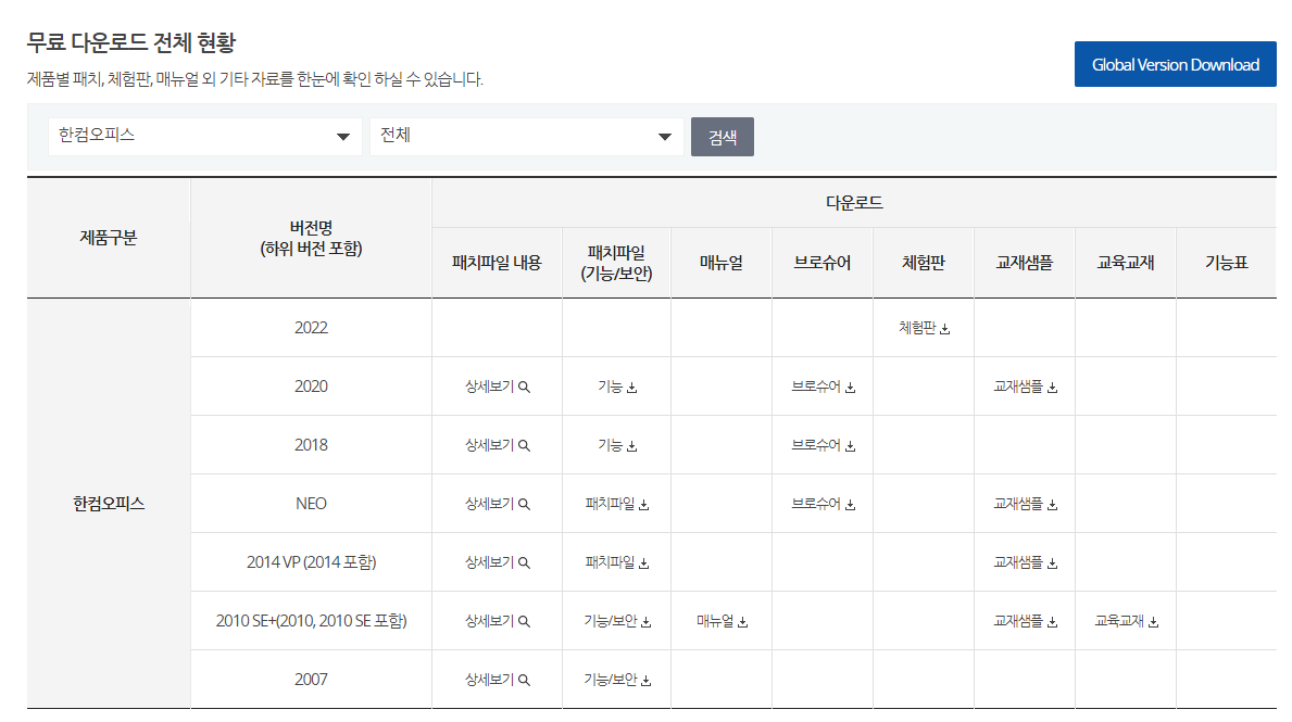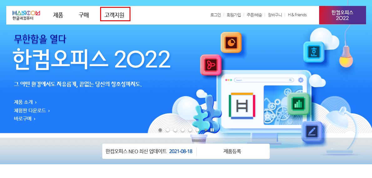 한글과컴퓨터 공식 홈페이지에 다운로드 페이지