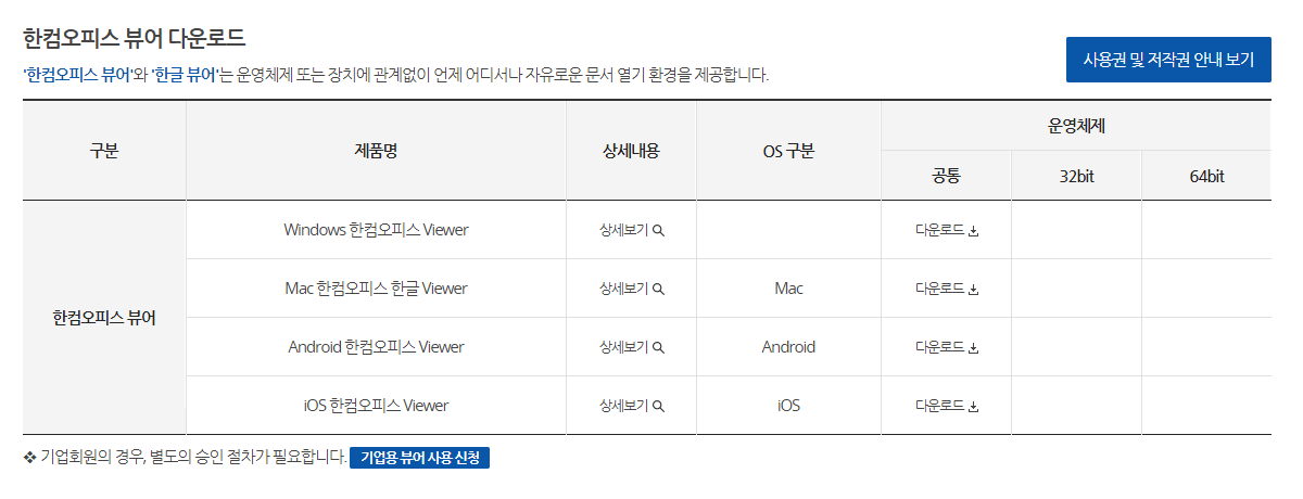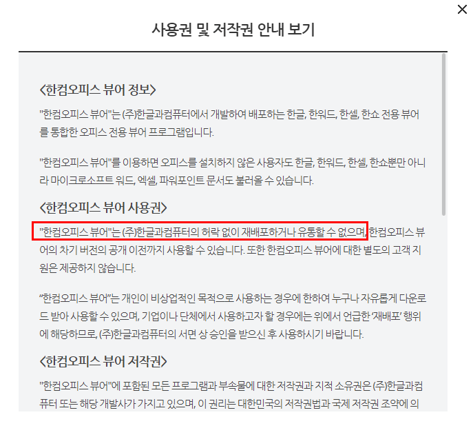 해당 한컴오피스 뷰어를 만약 전문 기업에서 사용하기 위해서는 별도의 뷰어 사용 신청 서비스를 작성하고 신청하기 절차를 꼭 수행해야합니다. 단순히 이미지에만 저작권이 존재하는 것은 아닙니다. 한컴오피스뷰어에도 이런 S/W 프로그램 저작권이 존재하기 때문에 해당 내용을 필수로 확인하고 기업에서 사용하길 권장 드립니다.