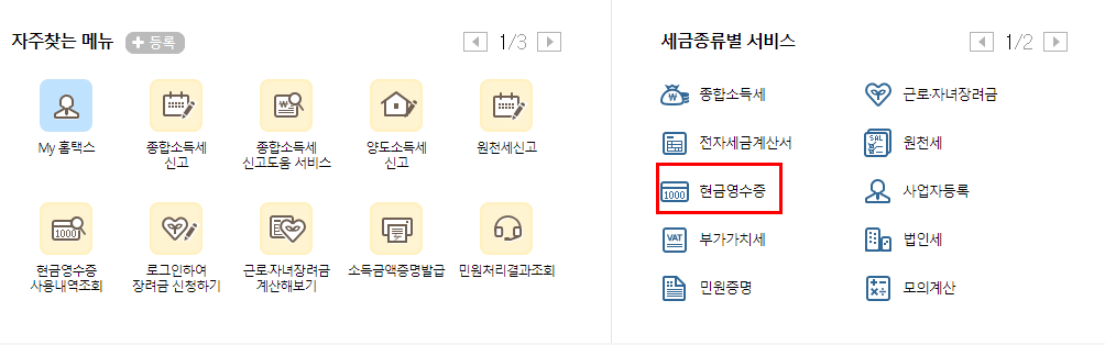 세금 종류별 서비스에서 "현금영수증" 메뉴를 클릭해주시면 됩니다. 해당 메뉴에는 현금 영수증 관련하여 필요한 다양한 서비스를 한곳에 모아둔 메뉴입니다.