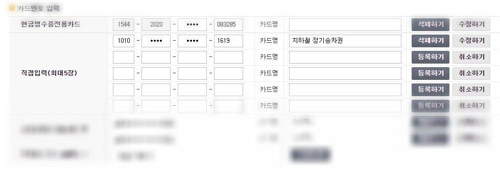 또하나 새로운 사실은 현금을 사용하는 카드별로 바로 현금영수증 소득 공제를 받을 수 있도록 등록하는 기능도 있더라고요. 저는 지하철 정기 승차권을 사용하는데, 해당 카드 번호를 현금 영수증 결제 수단 관리에 등록하면 지하철 정기 승차권에서 사용하는 금액이 자동으로 현금영수증이 발행된다고 합니다.
