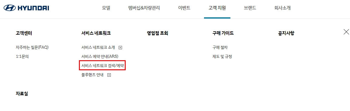 상단에 있는 고객 지원 메뉴를 클릭하시면 다음과 같이 하위 메뉴 구성을 확인 할 수 있습니다. 그리고 "서비스 네트워크 검색/예약" 버튼을 클릭하시면 됩니다.