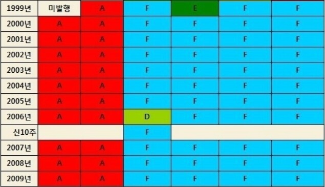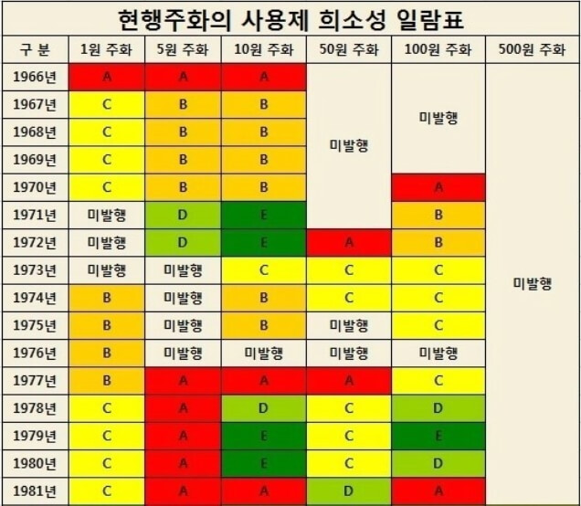 위에서 말씀드린 동전 이외에도 희소성에 가치를 부여받아서 높은 가격으로 거래되고 있는 동전들이 있습니다. 해당 정보를 확인할 수 있는 표를 아래 공유드립니다. 한번 확인해보세요.