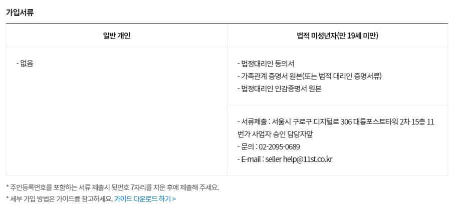 회원가입에 진입벽이 가장 적은 개인 셀러에 회원에 경우는 별도에 가입 서류가 필요하지는 않습니다. 단지, 미성년자에 경우 법정대리인 동의서와 같은 서류가 필요 할 수 있습니다. 추가적으로 개인셀러 활동 후에 과세기간, 판매대금에 따른 사업자 전화 기준에 대해서도 미리 확인해보세요.