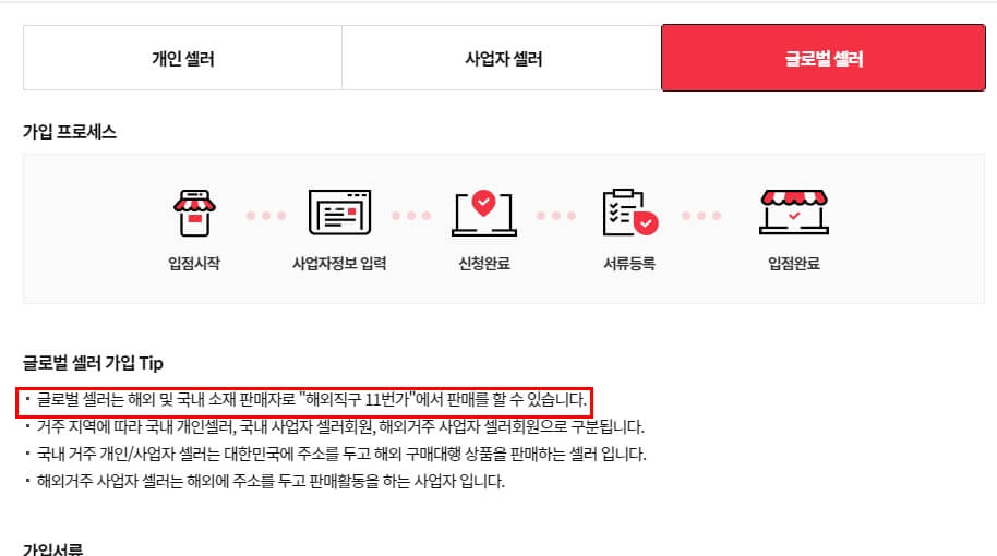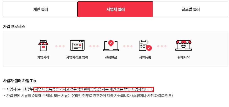 다음으로 확인 할 회원 유형은 "사업자 셀러" 입니다. 해당 회원유형에 경우는 정식으로 사업자를 설립하고 수행하는 기업 중심에 회원이라고 보시면 됩니다. 해당 회원 유형에는 개인사업자도 포함되는 것으로 판단됩니다.