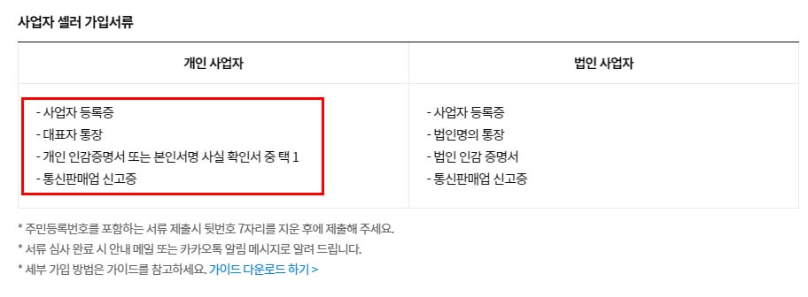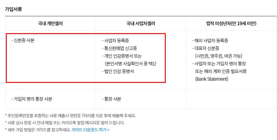 사업자 샐러에 경우 필요한 가입 서류는 사업자 등록증, 대표자 통장, 개인인감또는 본인 서명 사실 확인서, 그리고 온라인으로 판매가 주로 이루워지기 때문에 통신판매업 신고증이 필요 합니다. 그리고 법인 사업자에 경우는 다소 차이가 있을 수 있으니 가입 전에 또는 가입 중에 필요한 서류를 꼭 확인해주세요.