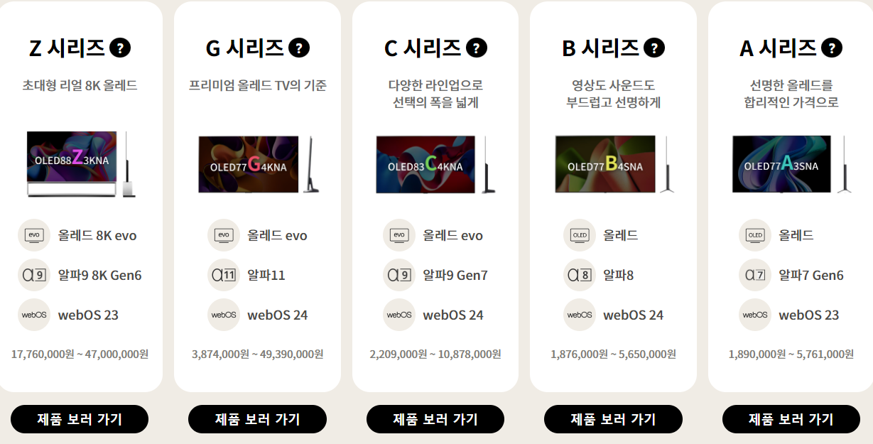 더 이상 복잡한 사양에 혼란스러워하지 마세요. 이 정보를 통해 여러분이 원하는 TV를 손쉽게 선택할 수 있도록 돕겠습니다! 가장 우측 모델이 가장 좋다고 보시면 됩니다!