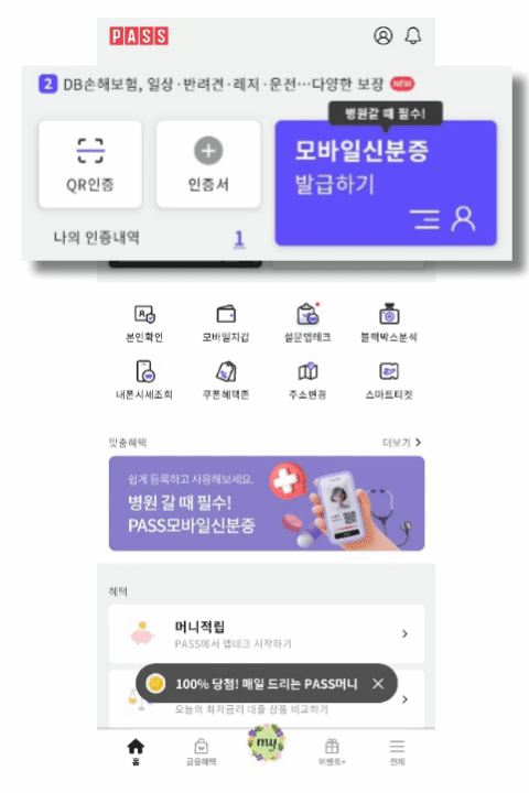 1. 다운로드 받으신, PASS 모바일 앱을 실행실켜주세요.