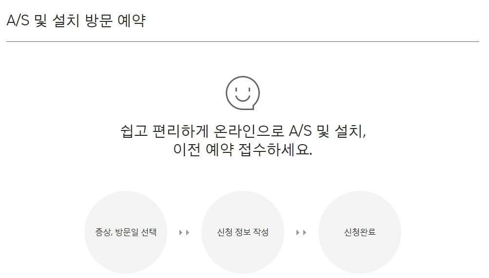 2단계에서는 서비스를 받고자 하는 제품 및 증상에 대해서 입력해주시면 됩니다. A/S 방문에 가장 중요한 과업은 날짜와 증상이라고 생각됩니다. 만약 엔지니어가 내가 희망하는 날짜에 못 올 수있기 때문에 희망날짜를 1순위와 2순위를 받고 있네요.