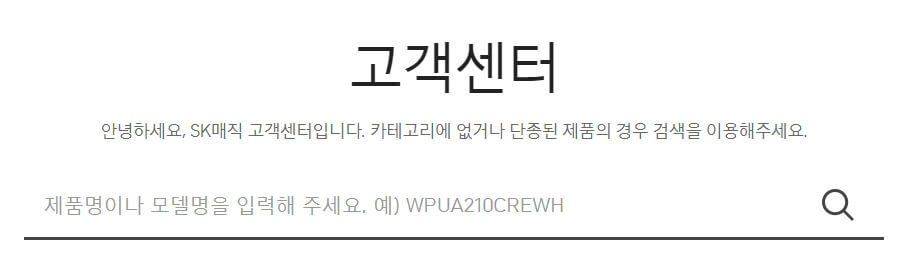 고객센터 페이지에 접속하면 다음과 같이 SK 매직 서비스 고객센터에서 지원하는 다양한 제품을 카테고리 별로 정리하여 제공하고 있습니다. 한 눈에 봐도 상당히 다양한 제품 군을 제공하고 있는 것을 알 수 있습니다.