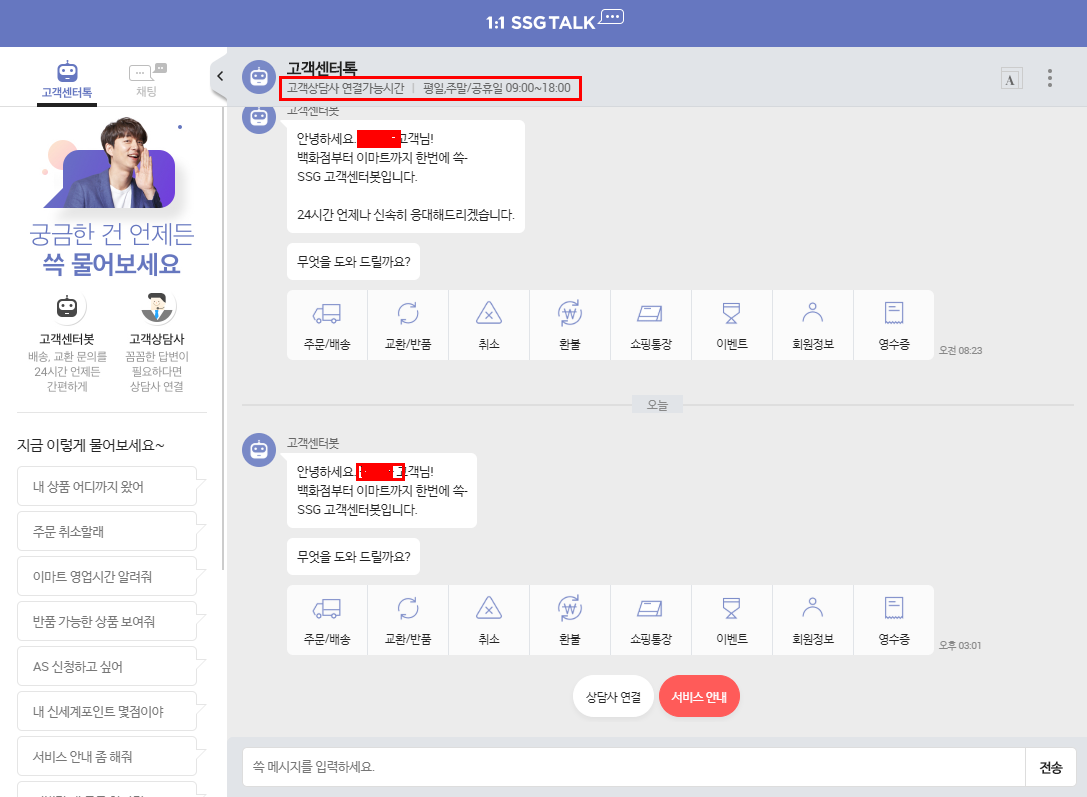 인지도가 높은 SSG 닷컴 서비스 고객센터에 경우는 새로운 신기술인 챗봇을 도입하여 이런 불편사항을 해결하고자 하였습니다. 고객센터톡이라는 챗봇 서비스가 해당 서비스 입니다. 사람이 아니라고, 반복적인 질문에 로봇(시스템) 응답하는 주요 서비스 입니다.