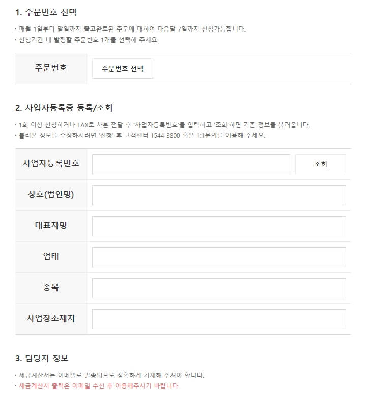 해당 메뉴를 클릭하시면 다음과 같은 화면을 확인 할 수 있습니다. 세금 계산서 발행하기 위해서는 대상이 되는 주문 내역을 선택해야합니다. 만약 사업자에 경우는 추가적으로 사업자 등록에 대한 정보도 입력해야합니다.