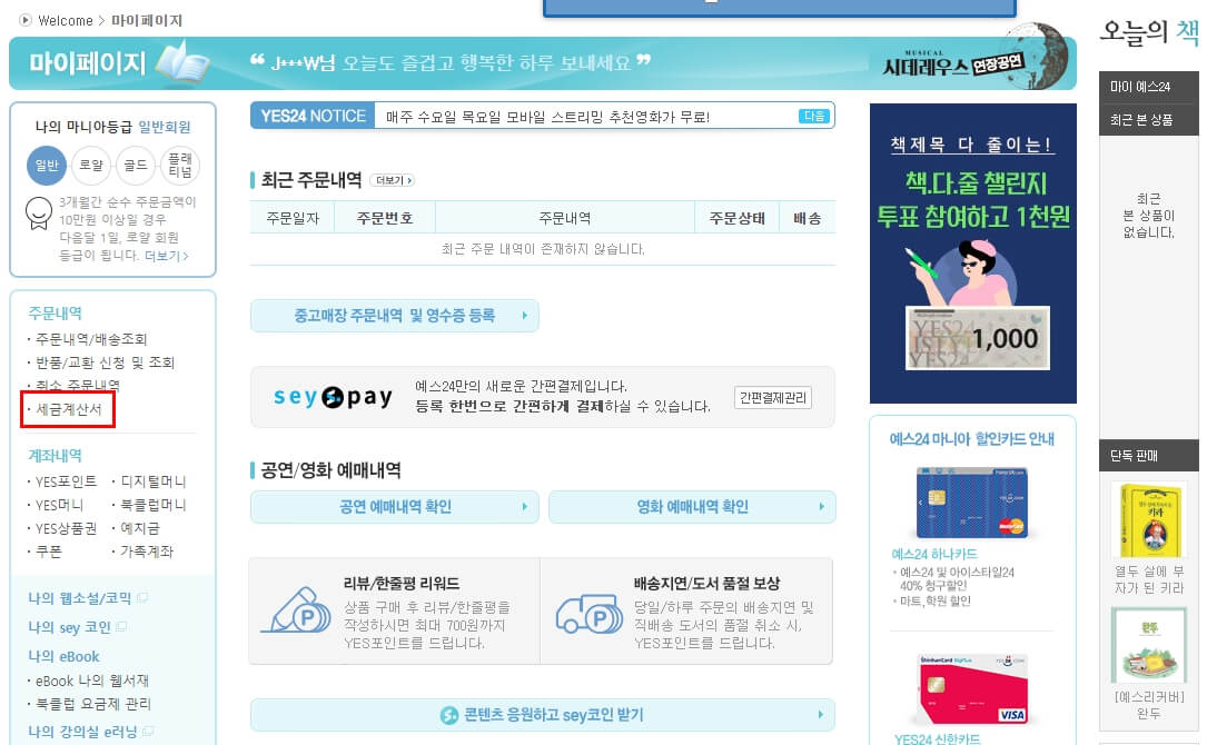 단순히 책만 구매한다고 생각했는데, 다른 추가적인 서비스를 이용할 일이 있더라고요. 대표적인 예스 24 고객센터 서비스 중에서 세금계산서 발행이 해당 서비스가 아닐까 싶습니다.