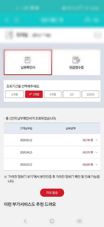 인쇄물이 아니고 다른 기간이나 사무실에 전송하기위해서 파일로 보내는 방법도 있지만, 바로 KT 요금 명세서를 Fax로 보낼수 잇또록 별도 서비스를 제공하고 있습니다.