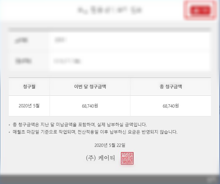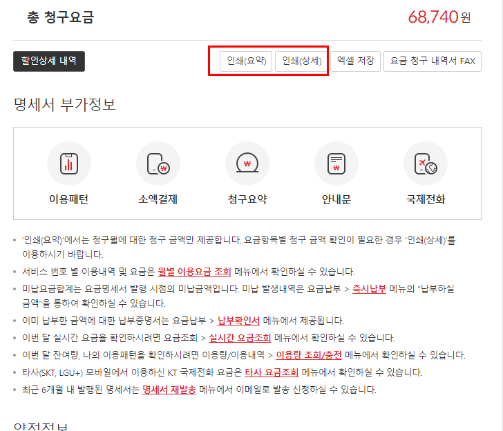 본인의 요금 내역을 요금 명세서 메뉴를 통해서 확인하셨다면, 이제 출력물을 필요한 분을 위해서 인쇄하는 방법에 대해서 체크해보겠습니다.