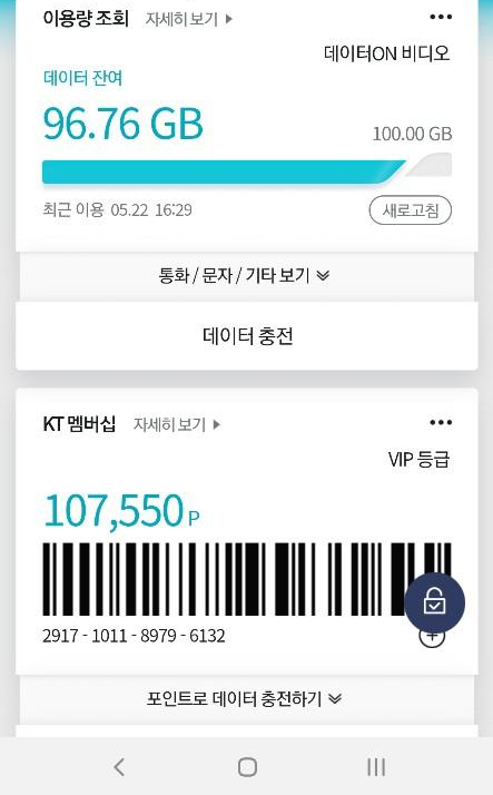 KT 단말기라면 기본적으로 설치가 도니 상태로 제공 되고 있습니다. 그 중에서 마이케이티 모바일 어플을 실행하시면, 다음과 같이 이용량 조회, KT 멤버쉽 포인트까지 확인 할수 있죠!