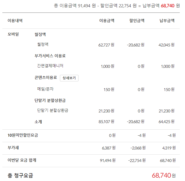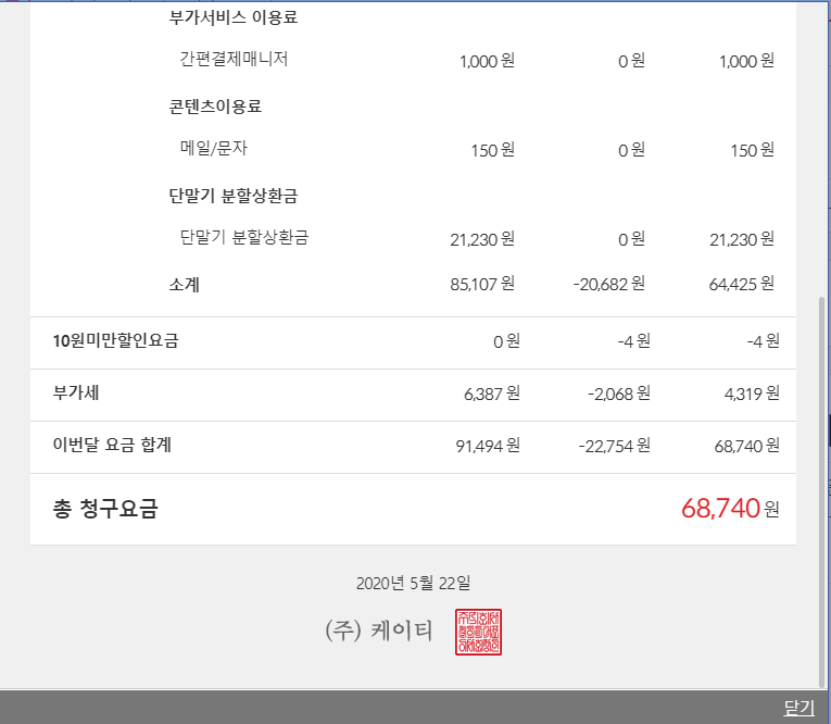 제 요금제는 그렇게 비싼 요금제가 아니지만 충분히 만족하고 사용하고 있습니다. KT 요금 명세서 상세 리스트에 다양한 정보를 확인 할 수 있습니다. 그 동안 모르고 있던 단말기 분할 상환금이 얼마인지 이번에 확인했네요.