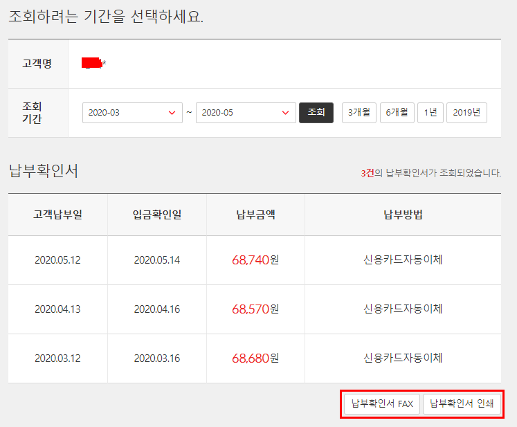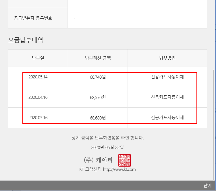 KT 요금 명세서 정보 이외에도 요금 납부 내역 확인서라는 메뉴도 존재합니다. 회사, 기간등에 요금 납부 내용을 증빙하기 위한 확인서라고 판단됩니다.