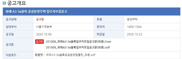 위례 A3 3a 분양가를 확인하기 이전에 공고상태부터 확인하는 것이 우선이라고 판단됩니다. 정식 아파트 공고는 전문 기관에서 확인하는 것이 제일 정확합니다. 해당 링크에서 확인하시면 됩니다.