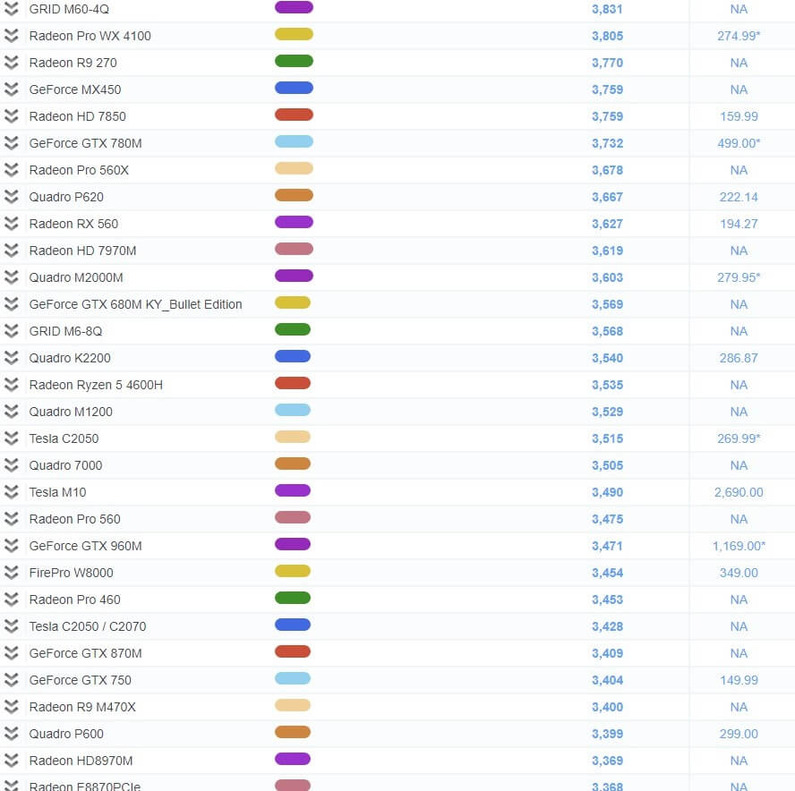 | 41 | Radeon Pro W5700 | 15,040 | 1,498.99 |