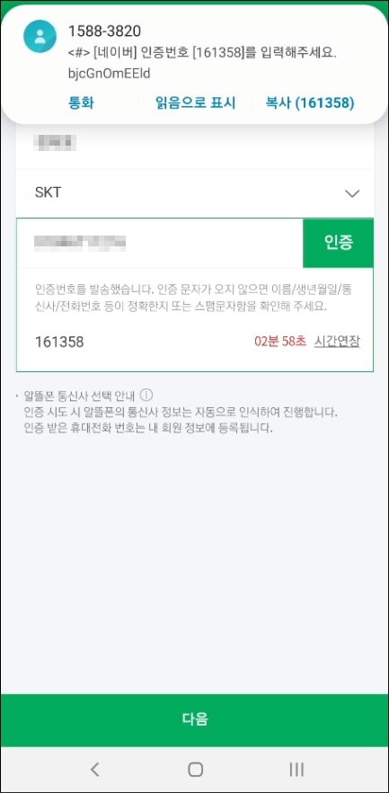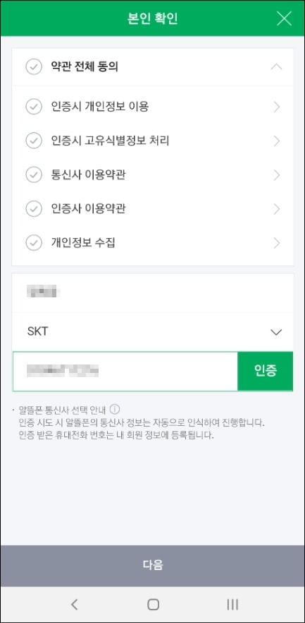 약관 동의와 본인 명의 핸드폰 번호로 인증 과정을 수행해주세요. 한 번만 진행하면 되니 귀찮더라고 수행해주세요.
