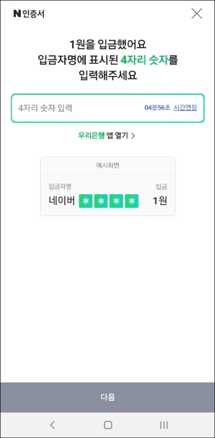본인 명의 계좌 은행과 번호를 입력하고 다음을 클릭하시면 됩니다. 그럼 해당 계좌로 1원이 입금되고, 입금자명에 4자리 숫자를 입력해주시면 됩니다.